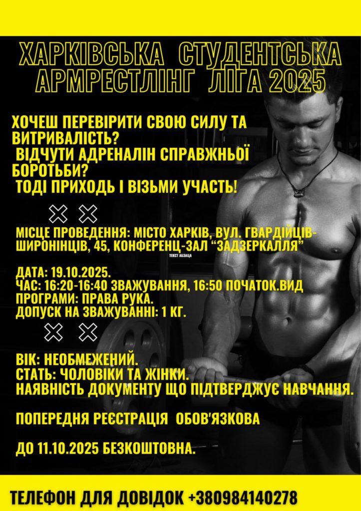 19 жовтня 2025 року в Харкові відбулися чергові змагання в рамках Харківської студентської армрестлінг ліги, які зібрали найсильніших представників закладів вищої освіти міста. У запеклій спортивній боротьбі за перемогу та титул найсильнішого учасники демонстрували витримку, техніку і справжній командний дух.